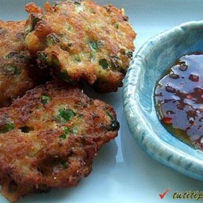 A halat egy turmixgéppel kb 20 másodpercig dolgozzuk el. Adjuk hozzá a lisztet, tojást, halszószt, curry pasztát, koriandert, és 10-20 másodpercig turmixszoljuk tovább. A masszát öntsük át egy tálba, és keverjük bele az aprított újhagyma és zöldbaba darabokat. Vizes kézzel formáljunk lapos fasírtokat, majd mély, forró olajban süssük ki õket aranysárgára. Papírtörlõn csepegtessük le.